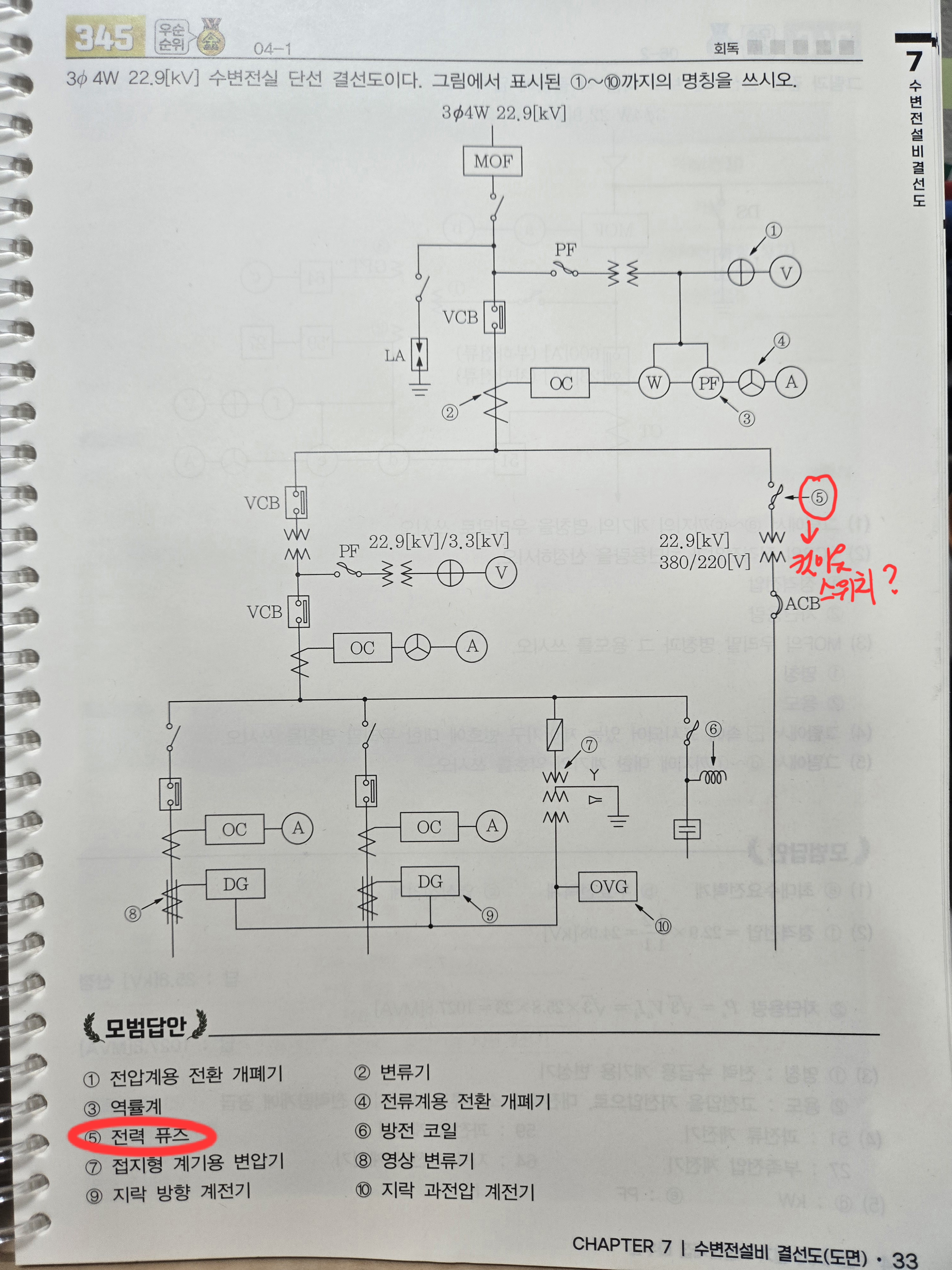 아래 결선도에서 5번 정답은 전력퓨즈라고 되어 있는데, PT(계기용 변압기) 앞에는 컷아웃스위치나 전력퓨즈 둘 다 가능한 것 아닌가요?
